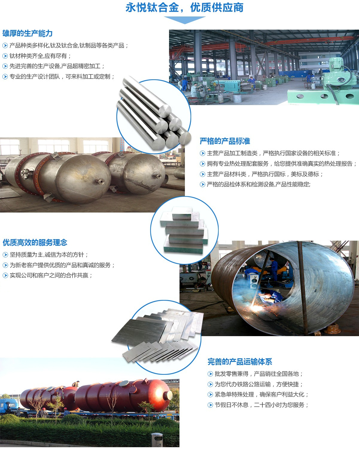 宝鸡永悦钛合金有限公司(简称:永悦钛合金),公司位于中国钛材基地—陕西省宝鸡市钛工业园区。 公司是专业从事钛及钛合金、难溶、稀贵金属材料的生产、深加工、出口于一体的现代化综合性企业。公司依托“中国钛谷”雄厚的行业资源,强大的有色金属科研及制造实力进行高效的资源共享。公司拥有一支年轻、朝气、创新、实干、创新的团队。拥有现代配套生产设备及检验检测设备,技术先进,工艺严格、设备完善、管理制度成熟等优势。在钛材料生产加工领域形成了较为完整的产业链,为用户提供优质可靠的产品。 永悦钛合金拥有以下几大主导钛产品: Ⅰ.材料类:钛材、镍材、锆材、钽材、铌材等稀贵金属材料。 Ⅱ.复合材料类:钛/钢、钛/铜、镍/钢等多种配比金属爆炸复合板。 Ⅲ.设备类:钛盘管、钛储罐、钛换热器、钛冷凝器、钛反应釜,钛搅拌设备、钛塔器等非标设备的设计与制造。 Ⅳ.制品类:钛及钛合金泵、钛阀、钛管件、钛法兰、钛标准件、钛阳极,钛种板及各种精铸配件。 产品被广泛应用于石油、化工、氯碱、制药、海洋生物、医药、污水处理、次氯酸钠、电镀等领域。 我们的生产理念:质量为主、用户满意、精益求精、务实...